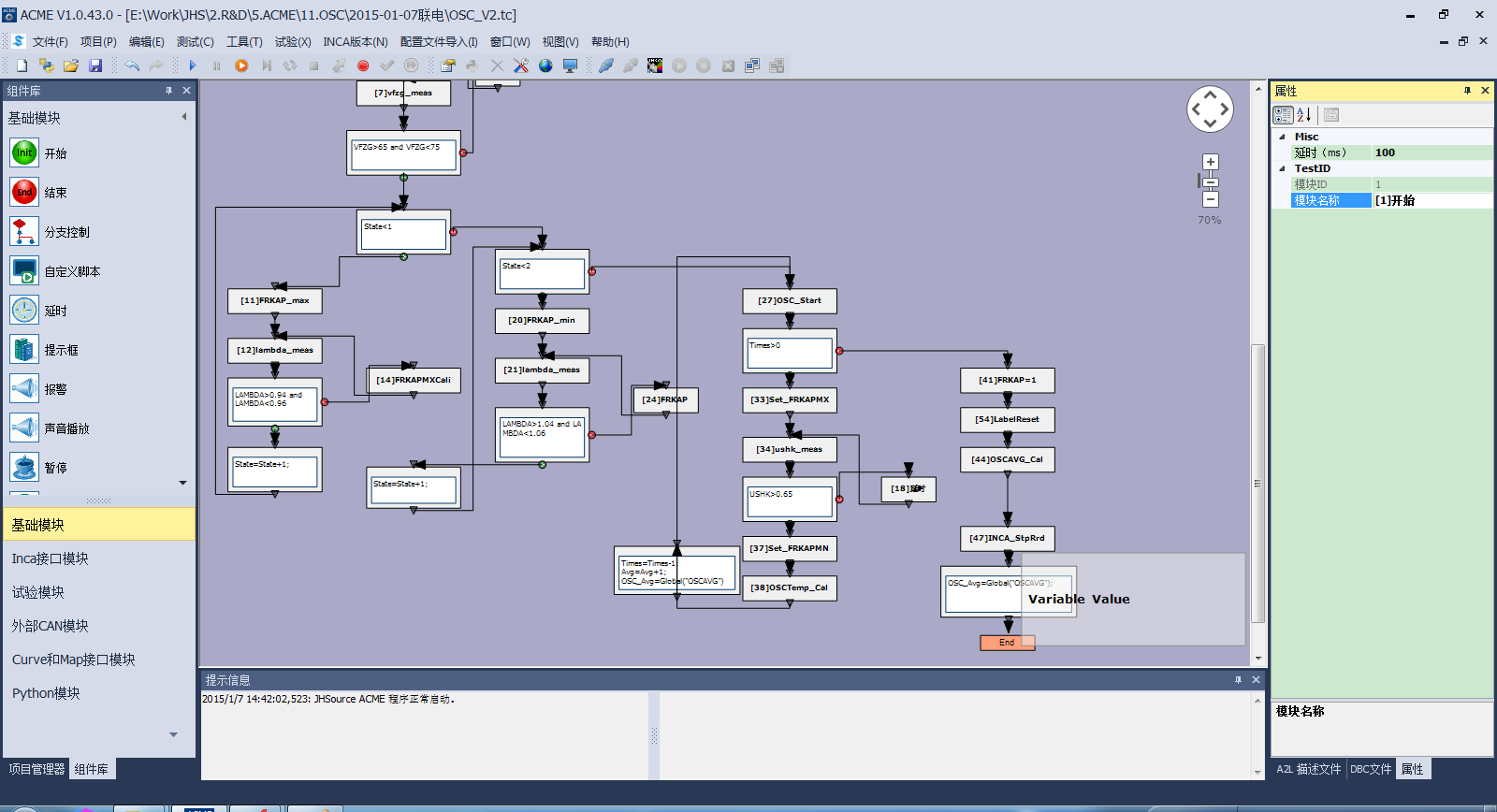 采用ACME已经开发出台架自动标定系统,能够完成充气模型、扭矩模型、点火角扫描、喷油相位等的台架自动标定;采用ACME也开发出OSC(储氧量)自动测量系统,只需要一名驾驶员,由ACME自动控制INCA完成空燃比跳变,自动完成OSC测试。