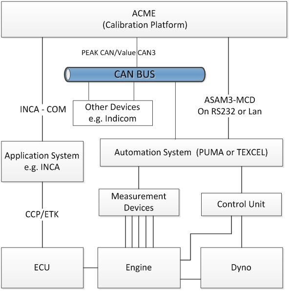 ACME还提供丰富的通讯接口,包括CAN通讯和ASAP3通讯。ACME能够导入CAN dbc文件,让ACME成为CAN收发节点,工作程师可以编写python脚本,将ACME变成CAN测试软件平台ACME具备ASAP3通讯,可以与发动机台架(Puma/Texcel等)系统通讯,轻松完成自动台架标定。ACME能够对INCA进行读测量值、写标定值、读取外部设备(ES630/ES430/ES410)、触发record 等工作。